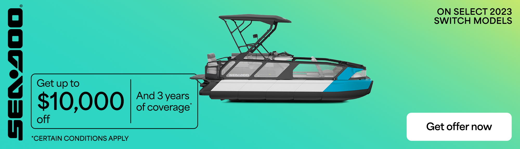 † Rebate up to $10,000 on 2023 Sea-Doo Switch models: Consumers who purchase a 2023 Switch 18', 19' or 21' are eligible to a $10,000 rebate. Consumers who purchase a 2023 Switch 13' or 16' are eligible to a $8,000 rebate.