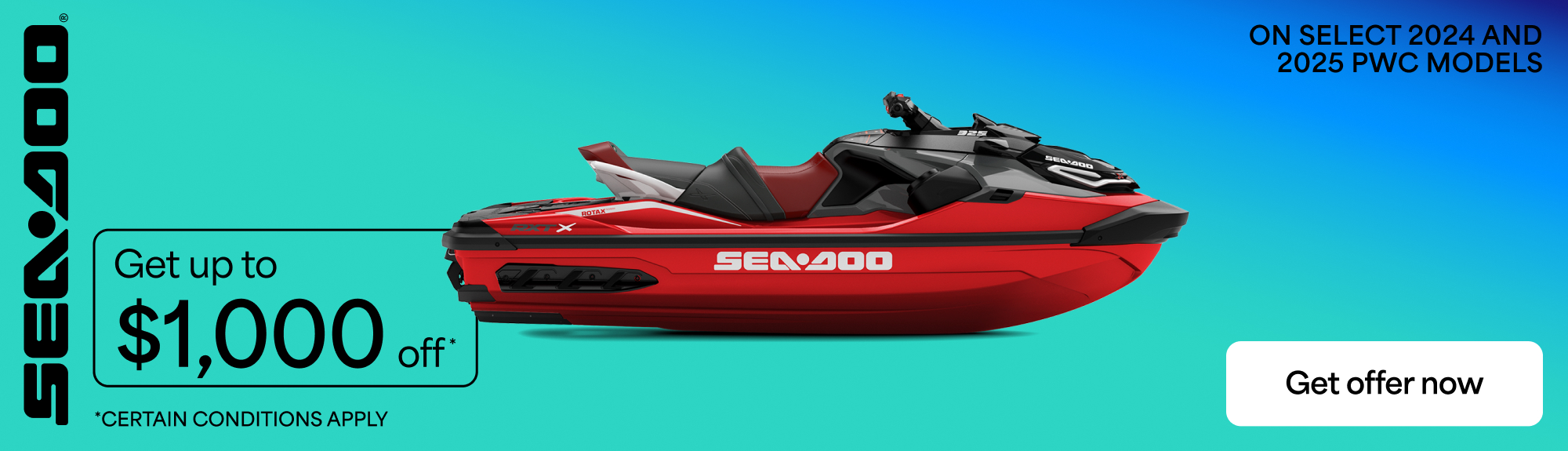 "©2025 Bombardier Recreational Products Inc. (BRP). All rights reserved. ®, ™ and the BRP logo are trademarks of BRP or its affiliates. In the U.S.A., products are distributed by BRP US Inc. Offers valid in U.S.A. at participating Sea-Doo® dealerships only from December 1, 2025 to March 31, 2026. Conditions may vary depending on your location and this offer is subject to change or termination at any time without notice. This offer is not refundable, exchangeable or transferable (including from one dealership to another), cannot be redeemed for cash, credit or other products of equivalent value and cannot be combined with any other offer or rebate. Null where prohibited by law. Until supplies last. Returns of any portion of the purchase will require equal forfeiture of offer or amount equal to the offer. Eligible models are all new and unused 2024-25 Sea-Doo personal watercraft models. Other Sea-Doo models may qualify for other promotions, see local dealers for details.