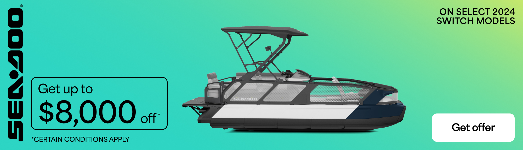 "©2025 Bombardier Recreational Products Inc. (BRP). All rights reserved. ®, ™ and the BRP logo are trademarks of BRP or its affiliates. In the U.S.A., products are distributed by BRP US Inc. Offers valid in U.S.A. only from December 1, 2025 to March 31, 2026. The conditions may vary depending on your location and this offer is subject to termination or change at any time without notice. This offer is not refundable, exchangeable or transferable (including from one dealership to another), cannot be redeemed for cash, credit or other products of equivalent value and cannot be combined with any other offer or rebate. Null where prohibited by law. Until supplies last. Returns of any portion of the purchase will require equal forfeiture of offer or amount equal to the offer. Eligible units are all new and unused 2024 Sea-Doo Switch models. Other Sea-Doo models may qualify for other promotions, see local dealers for details.