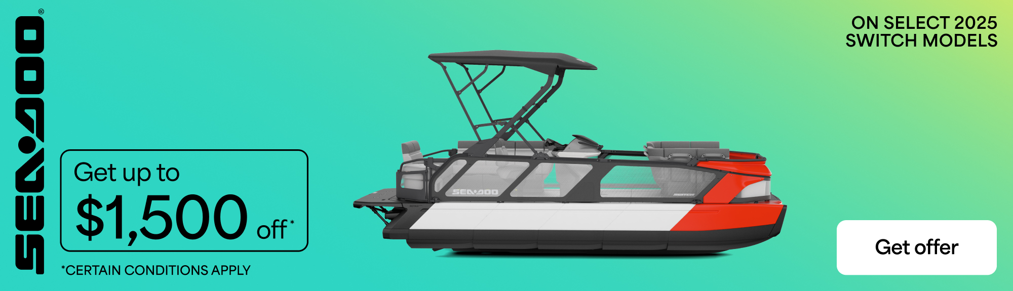 "©2025 Bombardier Recreational Products Inc. (BRP). All rights reserved. ®, ™ and the BRP logo are trademarks of BRP or its affiliates. In the U.S.A., products are distributed by BRP US Inc. Offers valid in U.S.A. only from December 1, 2025 to March 31, 2026. The conditions may vary depending on your location and this offer is subject to termination or change at any time without notice. This offer is not refundable, exchangeable or transferable (including from one dealership to another), cannot be redeemed for cash, credit or other products of equivalent value and cannot be combined with any other offer or rebate. Null where prohibited by law. Until supplies last. Returns of any portion of the purchase will require equal forfeiture of offer or amount equal to the offer. Eligible units are all new and unused 2025 Sea-Doo Switch models. Other Sea-Doo models may qualify for other promotions, see local dealers for details.